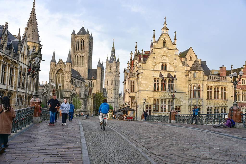 Perspective : Sur le pont Sint-Michielsbrug, nous avons une des plus belles perspectives de la ville de Gand. À gauche, nous voyons l’hôtel des Postes de Gand (Oud Postgebouw), suivi de l’église Saint-Nicolas et du Beffroi.Précédent | Accueil | Suivant |
