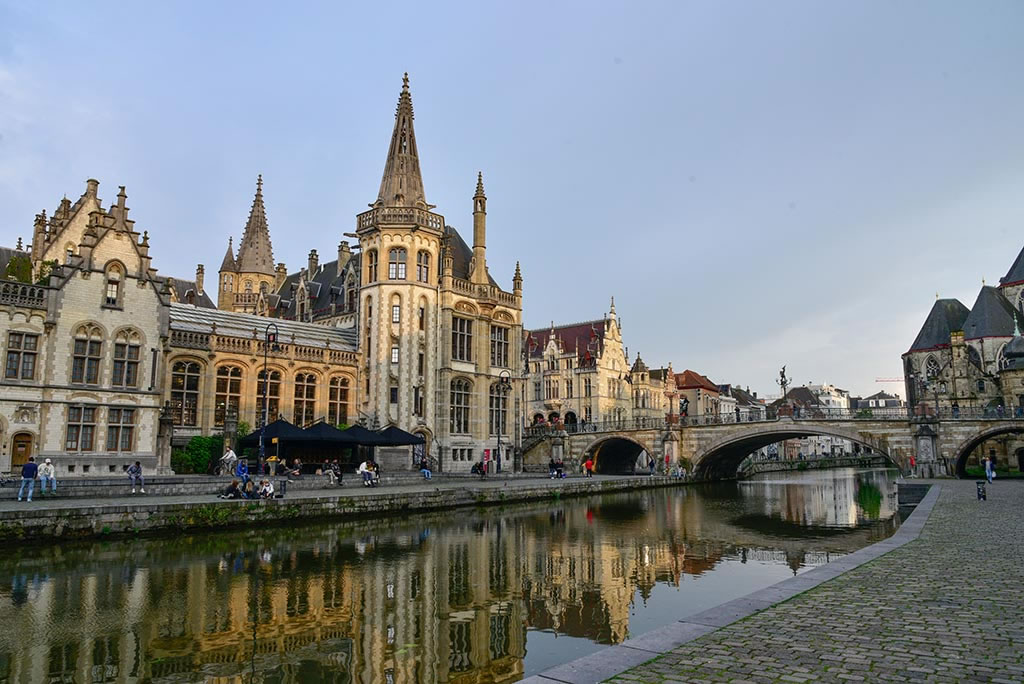À partir de la rue Korenlei, nous pouvons voir la rue Graslei de l’autre côté du Lys. L’imposant édifice au centre est le bureau de poste de la ville (Oud Posgebouw).