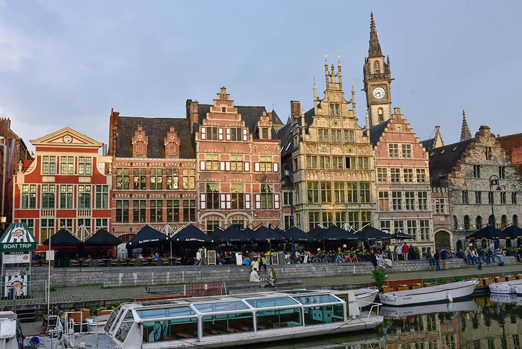 Lorsque le soleil se couche, les maisons de la rue Graslei prennent une couleur étincelante. Un beau spectacle.