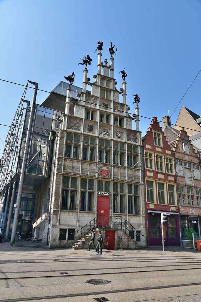 Construite au XVIs et située en face de l’église Saint-Nicolas, c’est la Maison Maçonnique. Au sommet du pignon à gradins, on aperçoit six personnes qui semblent s’amuser tout en dansant.