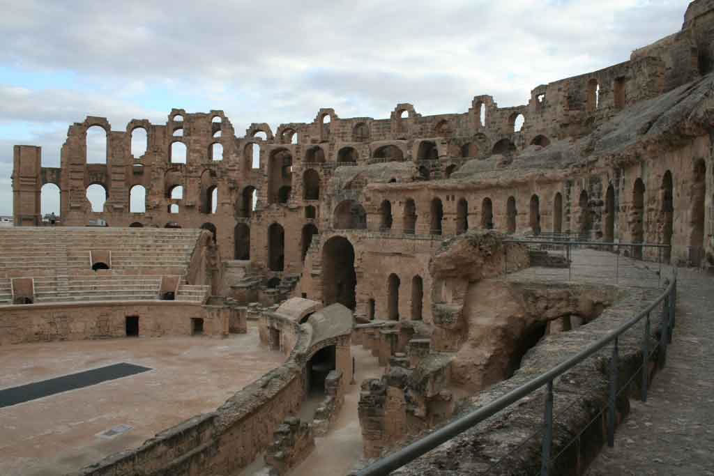 El Djem : Quand on l'aperçoit, on se pose tout de suite la question: Mais qu'est-ce que ce Colisée fait, perdu à l'intérieur des terres? On a peine à croire qu'au deuxième et troisième siècle, il y avait une ville aussi imposante.Précédent | Accueil | Suivant |