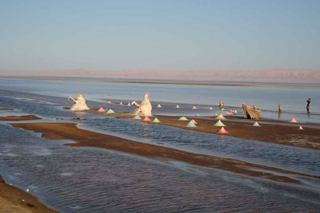 L'hiver, le lac est recouvert d'eau et en été l'eau s'évapore pour laisser place à une couche de sel et gypse cristallisés.