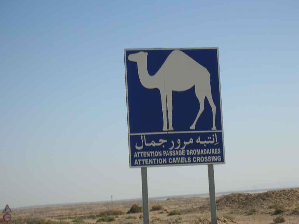 Passage de dromadaires : Au Québec, nous avons nos affiches pour nous avertir de nous méfier des orignaux et des cerfs qui peuvent traverser la route. En Tunisie, ce sont les dromadaires dont on nous avertit de nous méfier.Précédent | Accueil | Suivant |