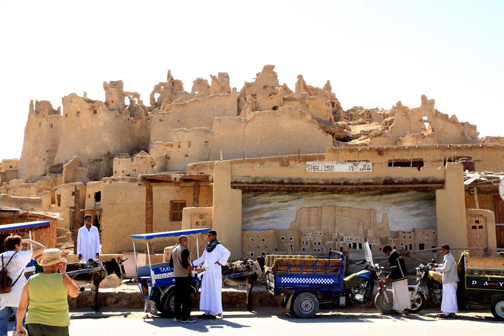 Oasis de Siwa : Dans cette zone désertique, il ne pleut pas souvent, mais quand la pluie tombe, elle est dévastatrice. Sur cette photo, on aperçoit les ruines de la forteresse de Shali, et à l'avant-plan à droite une maquette de la forteresse avant sa destruction. En 1926, des pluies diluviennes ont grugé la pierre de kershef.Précédent | Accueil | Suivant |